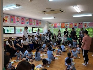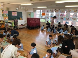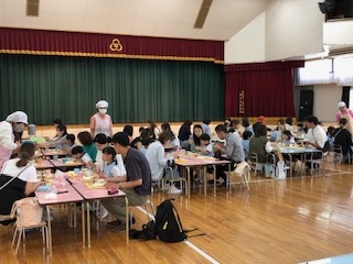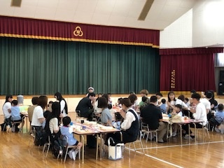 年長・年中・年少の各クラスは、1クラスずつ順番に、参観と親子のお食事会を行っています。 普段の保育の様子をお家の方に見ていただいた後、5年ぶりに園でのお食事会です。 いつもの給食もお家の人と食べると一段とおいしい様子です。
