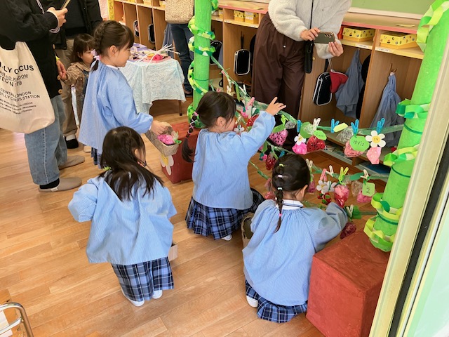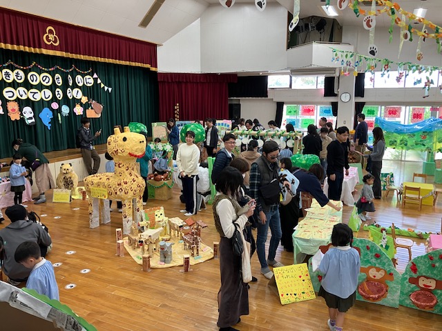 子どもたち自ら「こんなものをつくりたい」とイメージを膨らませ、意欲をもって取り組んできました。 自分のこだわりポイントを説明したり、ごっこ遊びに没頭する姿を見てもらったり・・・ まだまだ、みんなで遊びますよ。